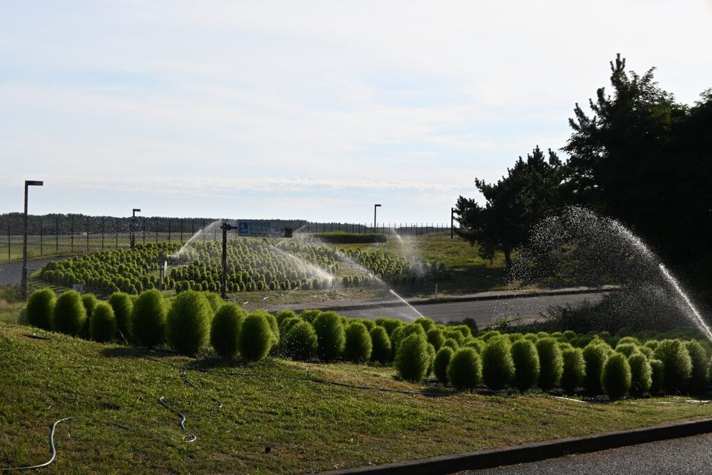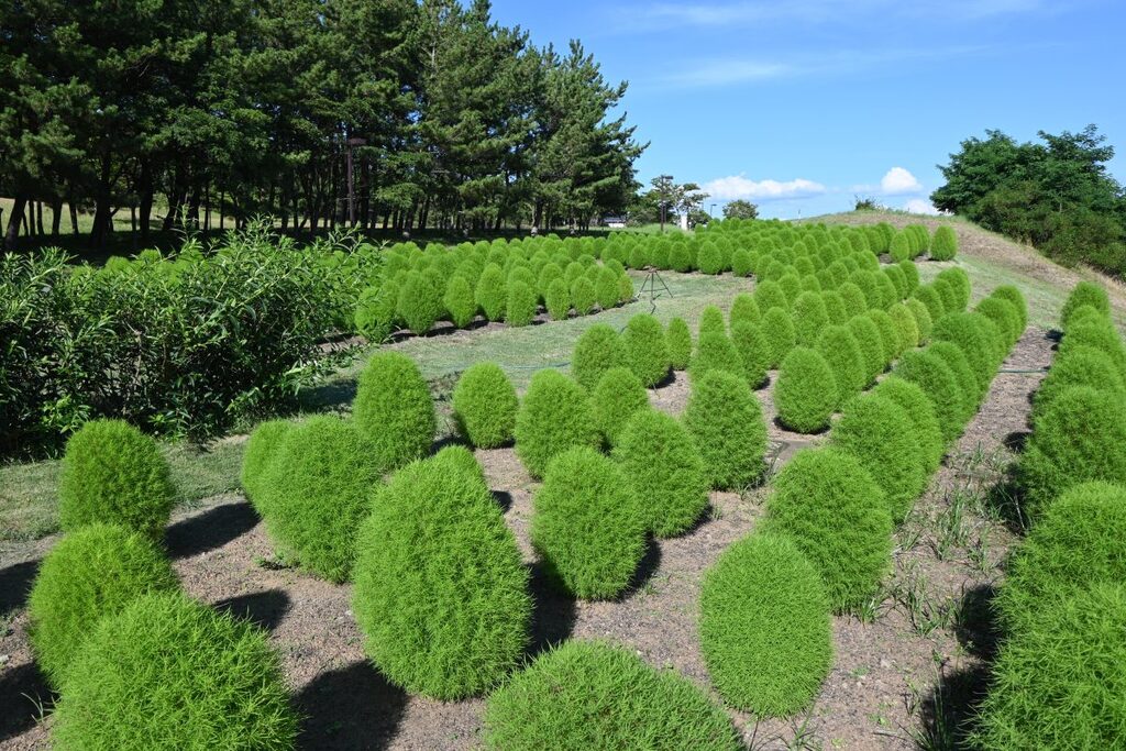 コキアは別名ほうきぐさといって、一年草なので、枯れたら抜いて、春また新しい苗を植えるんだそうです。暑い夏はスプリンクラーで毎日水かけを行っているそうです。手がかけられています。