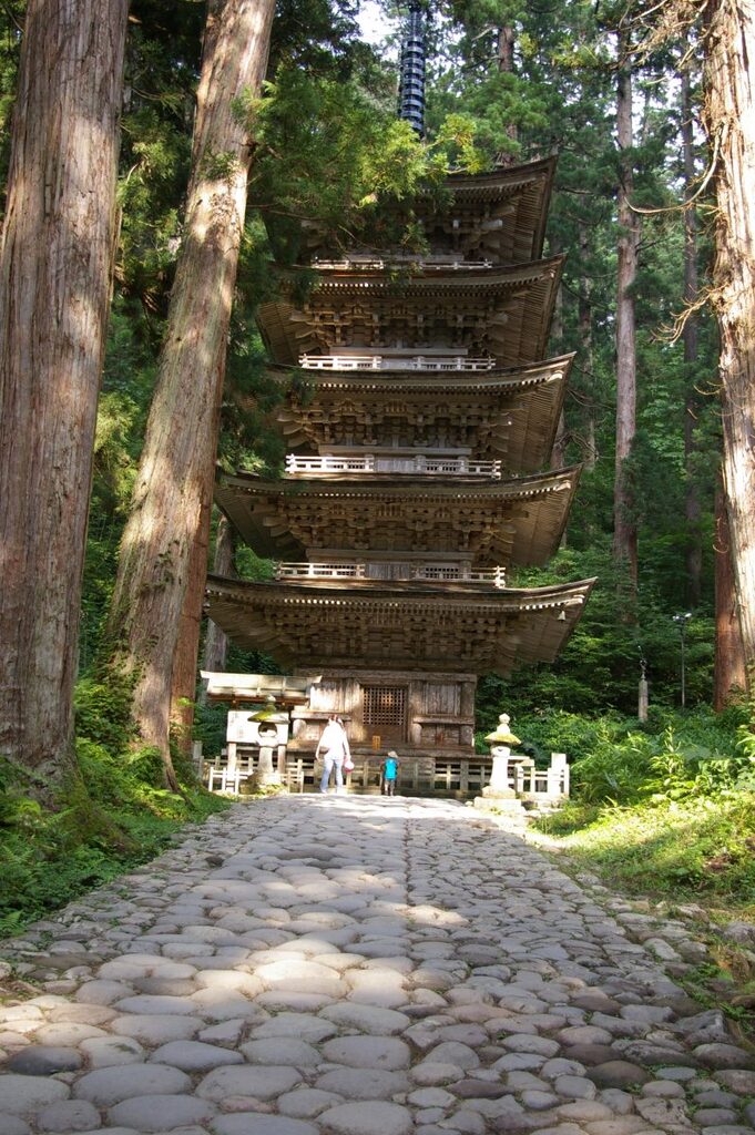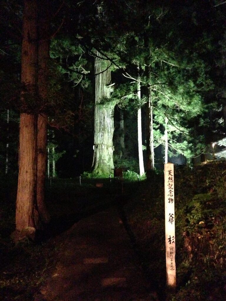 夜間参拝は期間限定、五重塔、爺杉など、参道と共にライトアップされます。