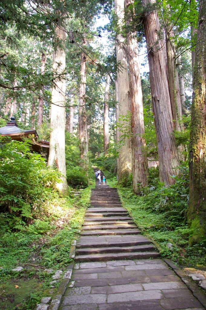 ミシュラングリーンガイドジャポン2009に三つ星の特別天然記念物、杉並木の中をここからずっと山頂まで登って三神合祭殿につきます。