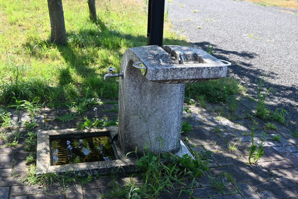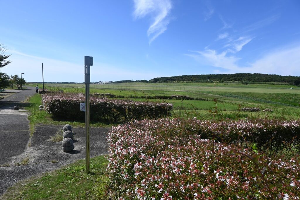 橋を渡ると、花のゾーンの入口。滑走路がすぐです。数台停められる駐車場、トイレ、水飲み場がありました。