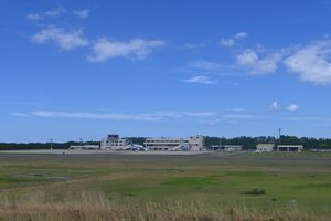 松の林の奥にベンチがありましたが、現在使えませんでした。テラスを降りると、空港のターミナルが間近に見えてきます。