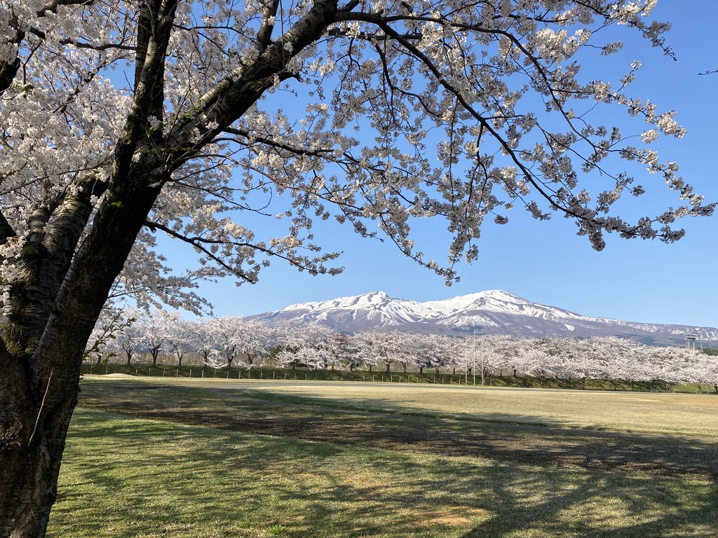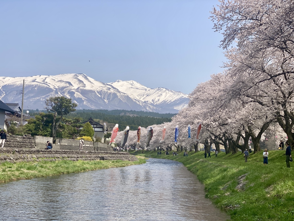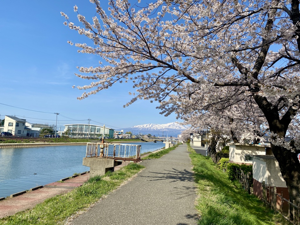 雪をいただく鳥海山と月光川の土手沿いの桜
