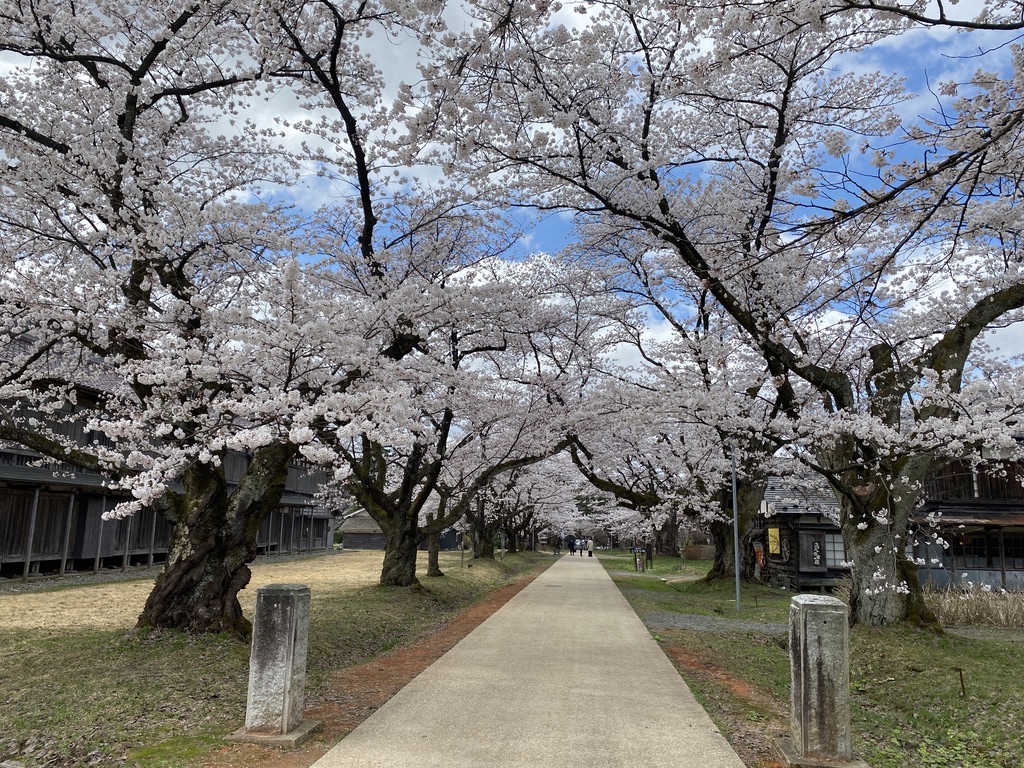 朝日地域は雪が深く、雪が残る時期に桜が咲くレアな景色を見れる年もあります。