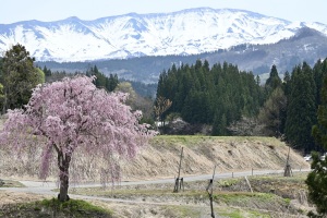 「大吉桜」と呼ばれているそうで、雪の月山を背景に可憐な姿を見せる。
