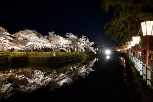 日本のさくらの名所10選にも選ばれていて、夜のお堀にはぼんぼりが灯り、城下町の桜を浮かび上がらせる。