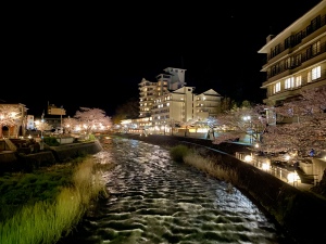 あつみ温泉街の1951年大火災の時に復興を願った桜が温海川沿いに植えられている。