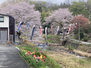 開花中川にかけられるこいのぼりが風にそよぎ、桜散る様子は心洗われる風景です。