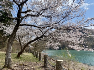 荒沢ダムの静かな水面を彩る春の景色です。