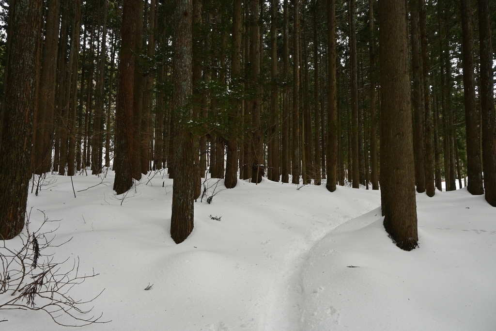駐車場から数分、杉林の中を歩いていきます。遊歩道になっていて歩きやすいです。
