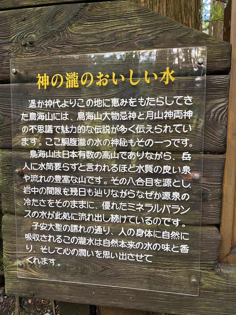 鳥海山のお腹の部分から水が湧き出る伏流水なので、お腹や安産にご利益があると水を汲みに遠方からも訪れる人が絶えません。