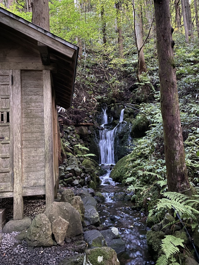 祠をはさんで右と左に滝が流れ、合わさって流れています。冬も凍りません。