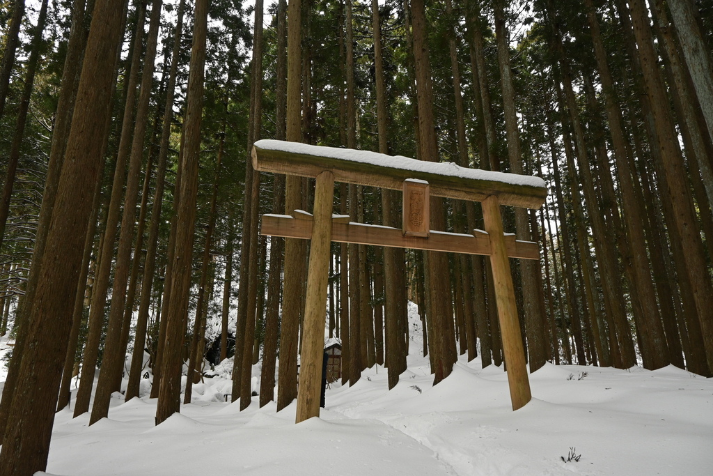 杉林のなか、途中に木製の立派な鳥居があります。「不動尊」とありました。
