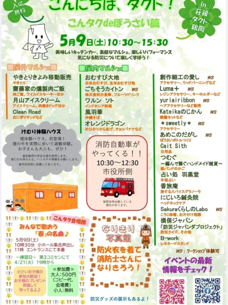 日時 2026年5月9日(土)10:30〜15:30 場所 荘銀タクト鶴岡 小ホール・エントランス・駐車場