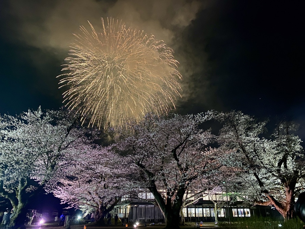 *夜桜花火 4月11日19時30分〜 約5分間 音楽に合わせての打ち上げ 赤川花火大会✕鶴岡青年会議所 ※4/12(日)は花火の打ち上げはありません (雨天順延の場合、12日になる場合もあります)