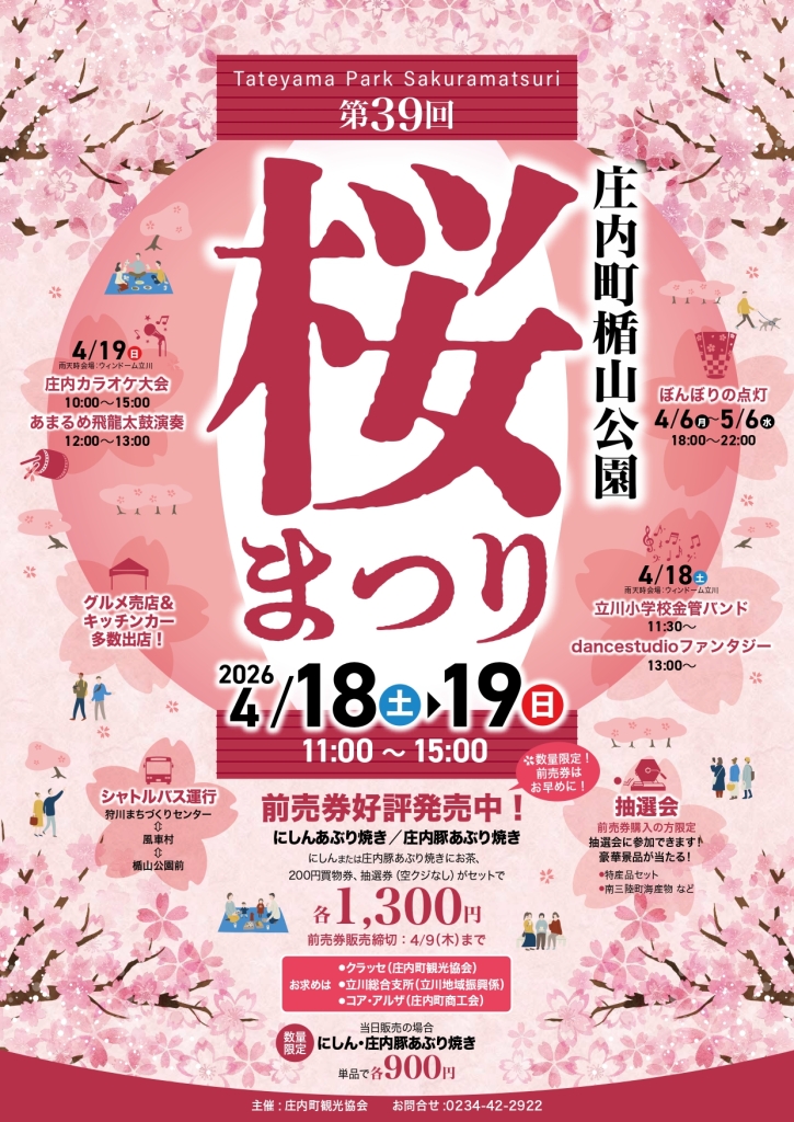 満開の桜のもと、名物「にしんあぶり焼き」や「庄内豚あぶり焼き」、各種グルメ売店・キッチンカーの出店、ステージイベントなど、子どもから大人まで楽しめる内容で開催。