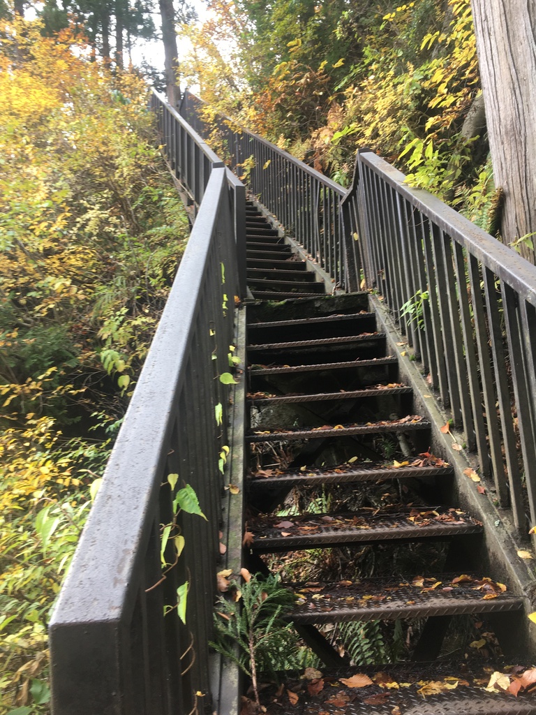 鉄製の階段を降りて、滝のすぐそばまで行ってみることができるので、迫力満点の人気のスポット。