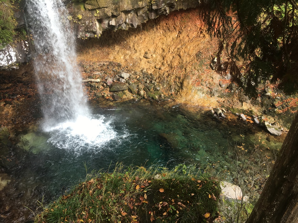 晴れた日は、滝壺がエメラルドグリーンでとてもきれいです。