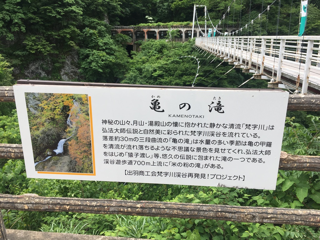梵字の茶屋の外にある亀の滝の看板。