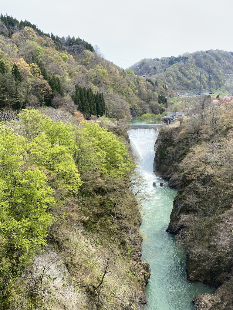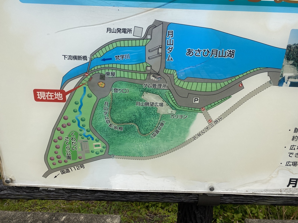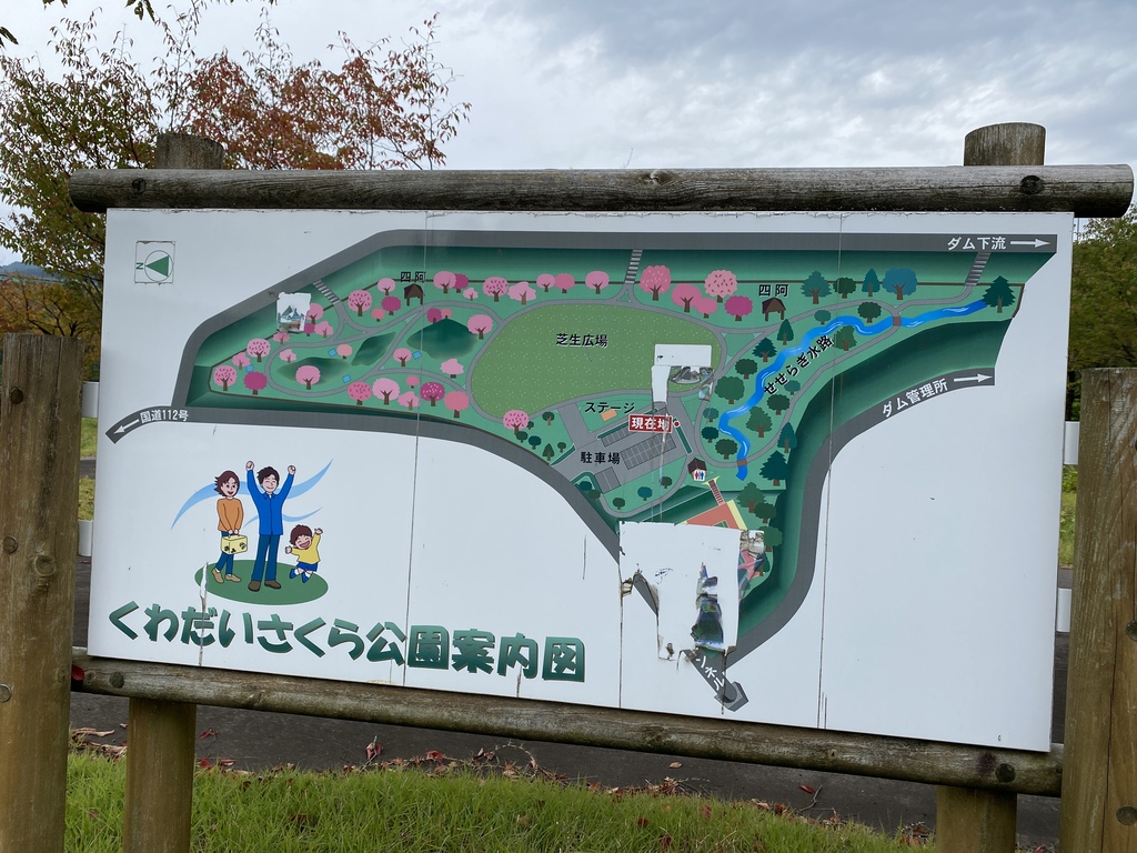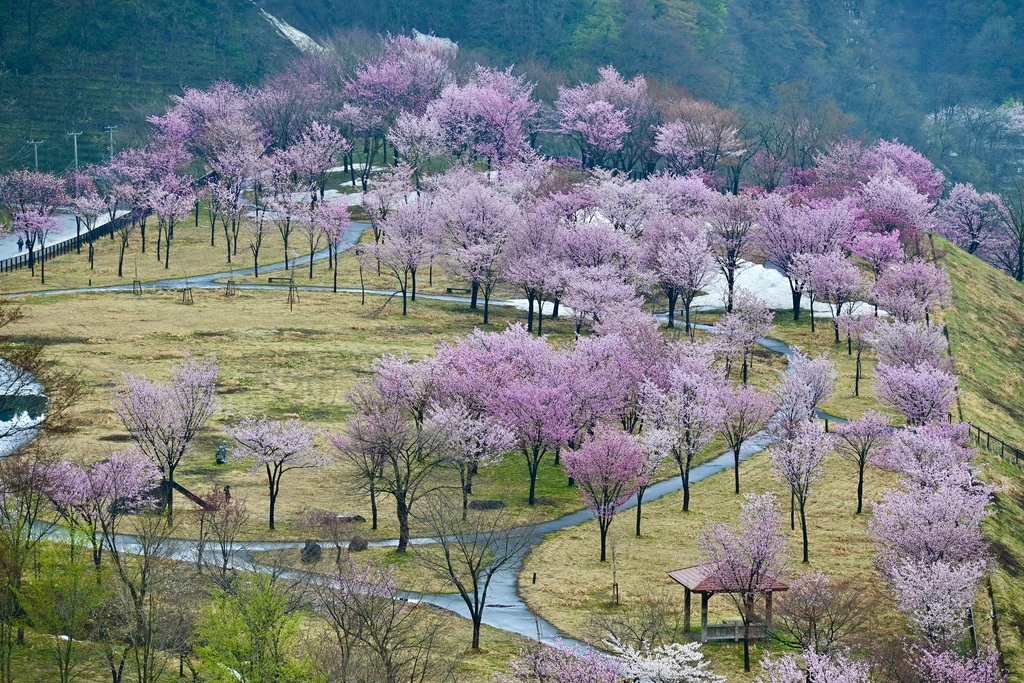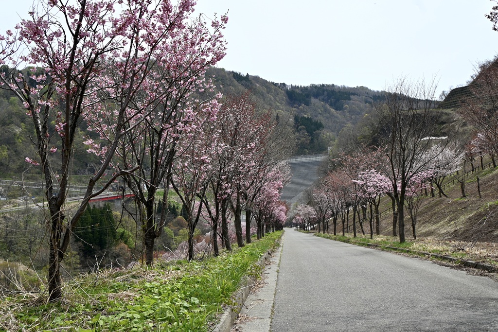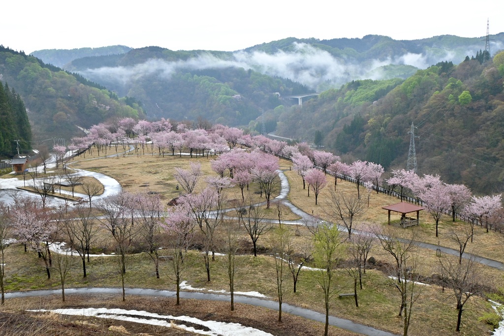 月山ダムのモニュメントから入ってダムの管理所方面へ行く途中にある公園。朝日千本桜として月山ダムの完成を記念して1995~