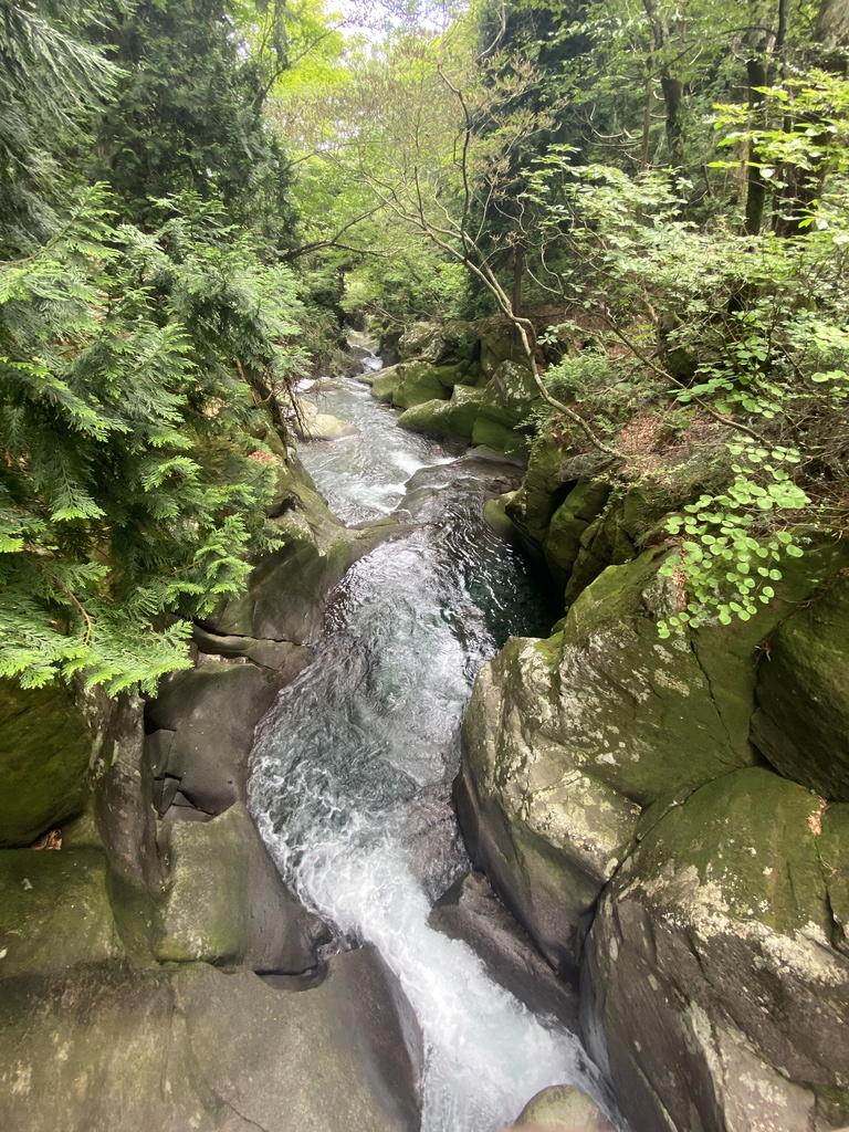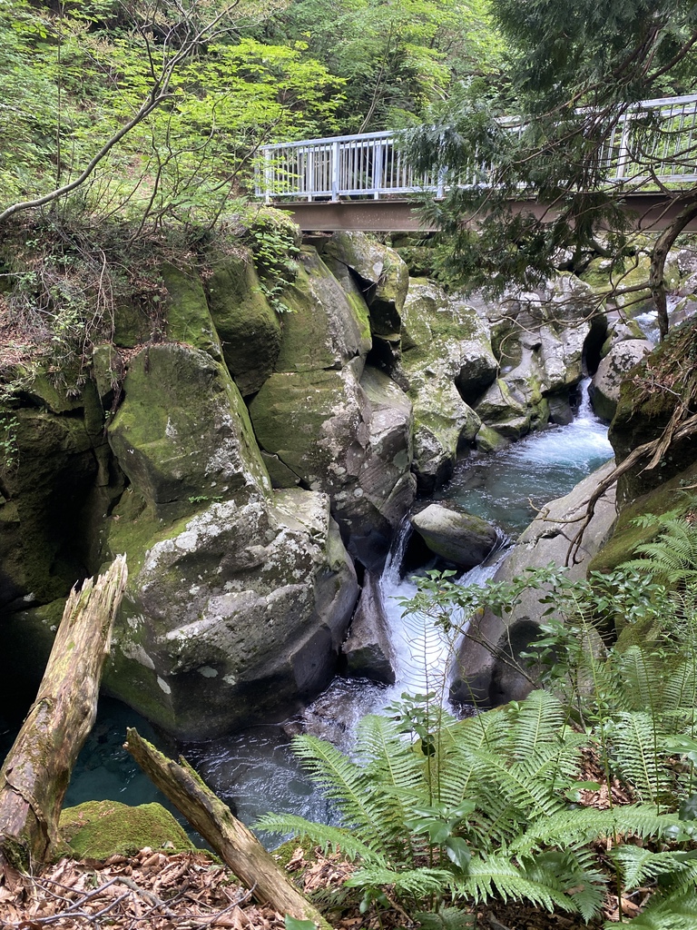 「狭霧橋」という金属製の橋から眺めることができる渓流美。