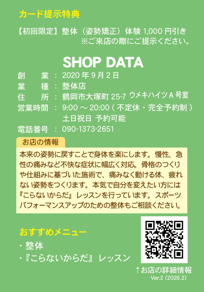 施術はもちろんですが、痛みなく動ける体、疲れない姿勢をつくるためのアドバイスをしてくれます。 『こらないからだ』レッスンも行っているそうなので、本気で自分を変えたい方にはぜひ!