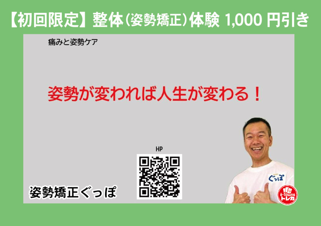 「姿勢改善ぐっぽさん」へこちらの無料体験当たったので行ってきました! 今まで色んな整体やカイロに行きましたが、ぐっぽさんは本当に1回の施術で体が軽くなり姿勢も綺麗になりました!! 簡単なストレッチまで教えて頂き家でもストレッチやっています!これから通わせて頂きます!