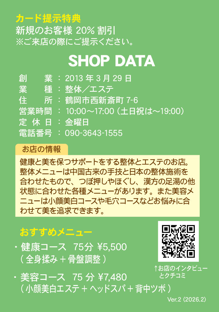 整体とエステの施術で、体を整え体の中からも外からも美しくなる店として「康楽美養生堂」をリニューアルオープン。内側と外側からアプローチする多種のメニューを用意し、健康に美しく楽しい毎日を送るお手伝いをしています。