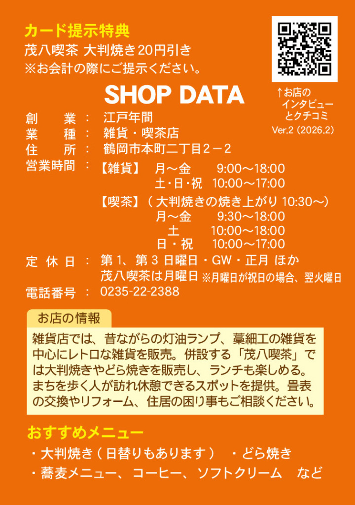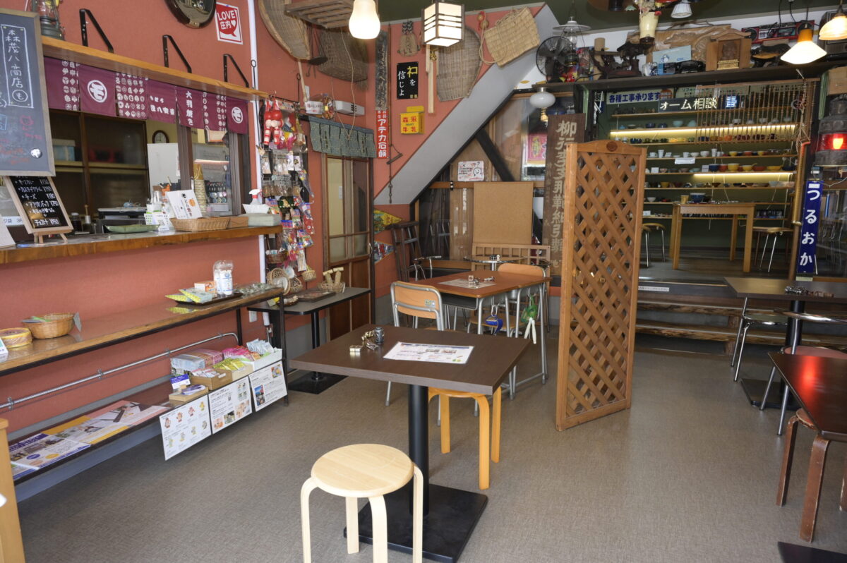 2024年に左側の店舗が喫茶店になり、焼きたての大判焼きを中心に、店内で休憩できるスペースができました。レトロな雑貨を見ながら観光客も訪れる面白いスポットとして注目されています。おそば、コーヒー、ソフトクリーム等も提供していて、e-Towns読者にとても好評です。(そのクチコミは下にスクロールしてご覧ください)