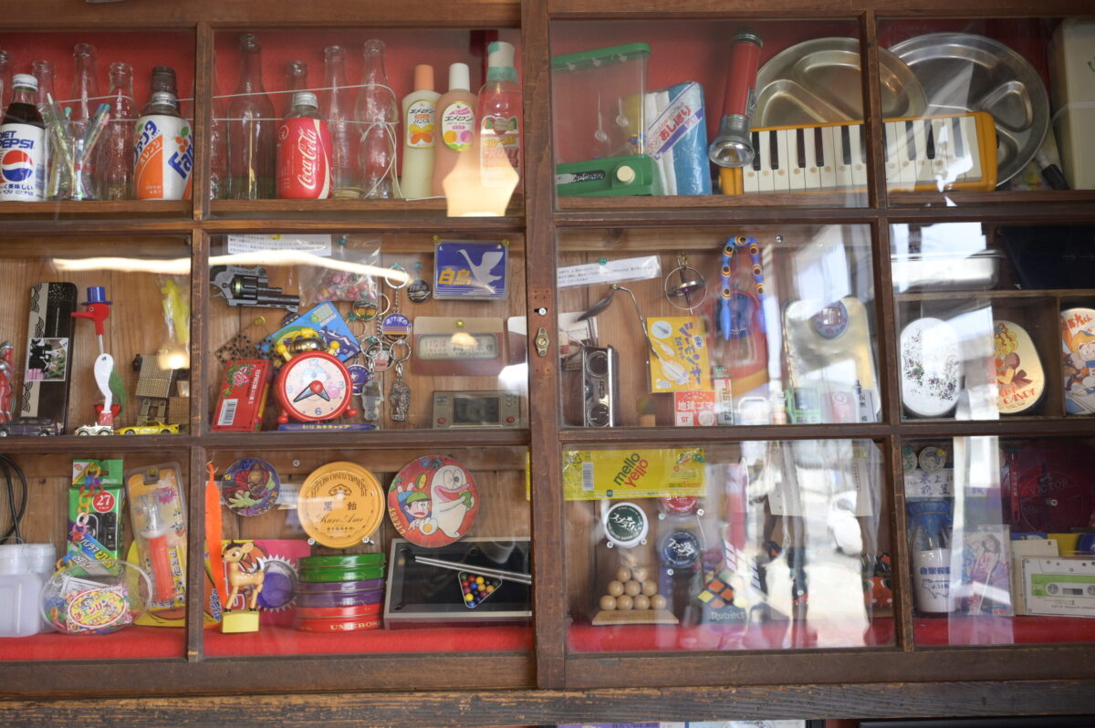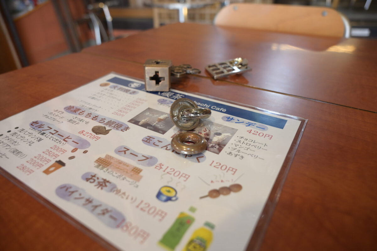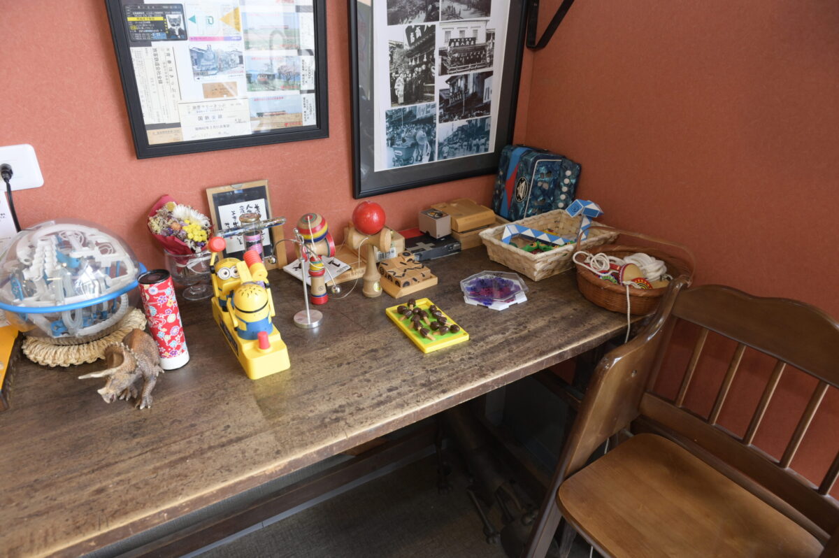 喫茶店には、知恵の輪や昭和の小さなおもちゃがあり、休憩しながら楽しめます。おふたりが見つけた器やレトロ雑貨など楽しいものが置かれていて昭和な雰囲気。中には販売しているものもあります。