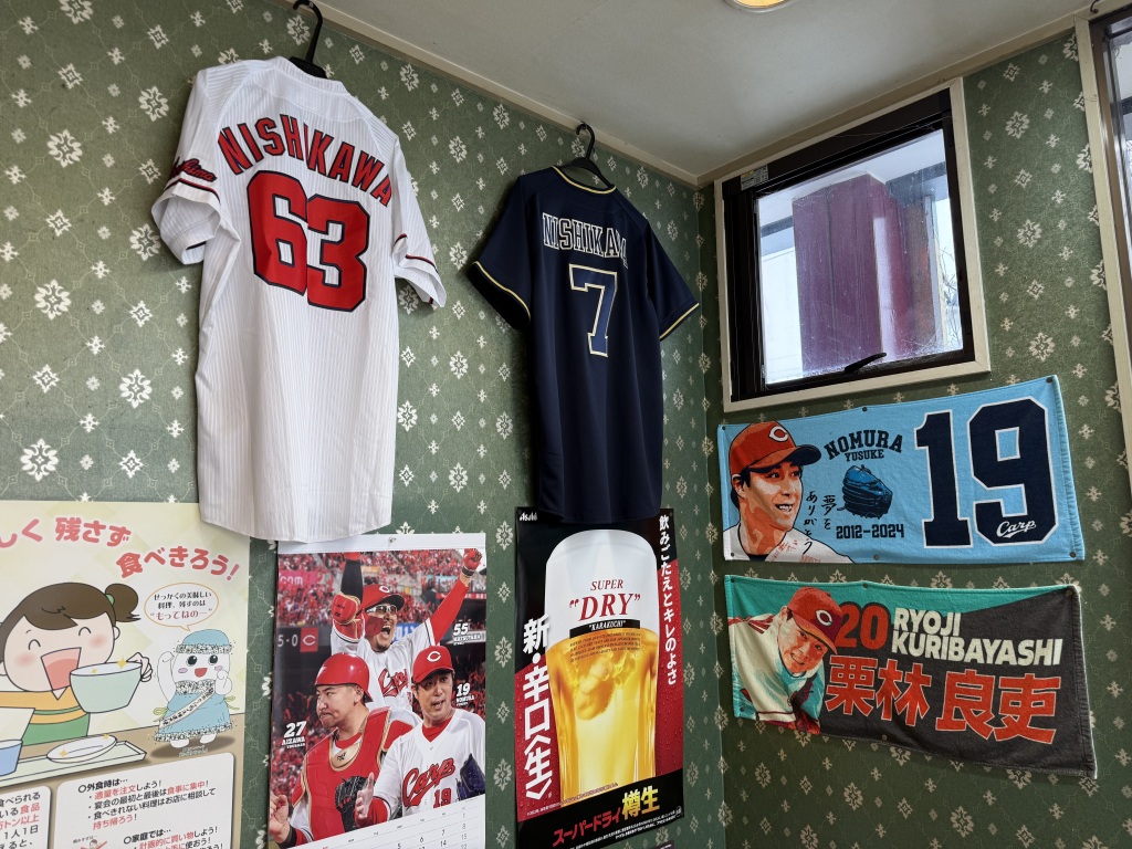 橋本さんの故郷広島に対する思いは深く、お好み焼きの味の決め手となるネギは、生まれ育った観音地区から都度取り寄せている。店内には広島カープのグッズやユニフォームが並び、メニューには呉焼き、江田島焼きなど地元の地名が入ったオリジナルメニューも考案した。