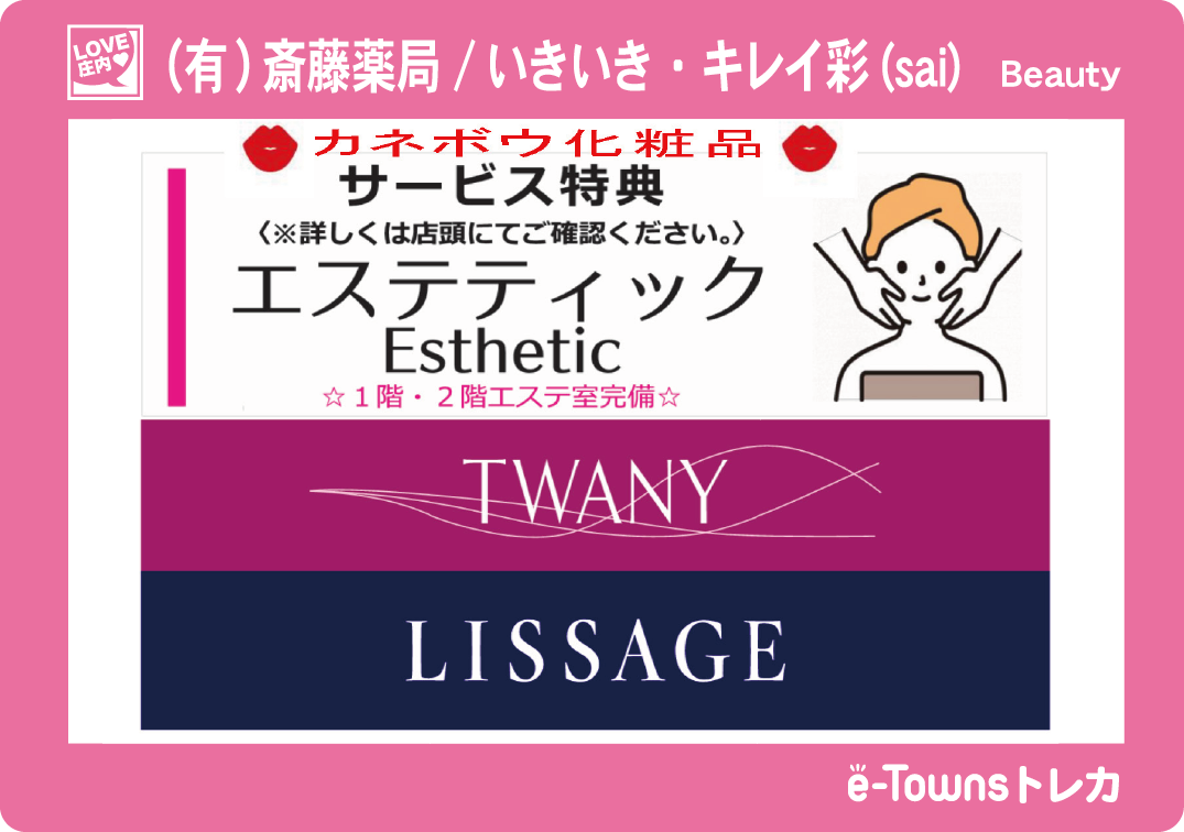 斎藤薬局さんの『いきいき・キレイ彩(sai)』はカネボウ化粧品の特約店で「TWANY」や「LISSAGE」などカウンセリングを行うお店でしか扱えない化粧品シリーズも扱っています。