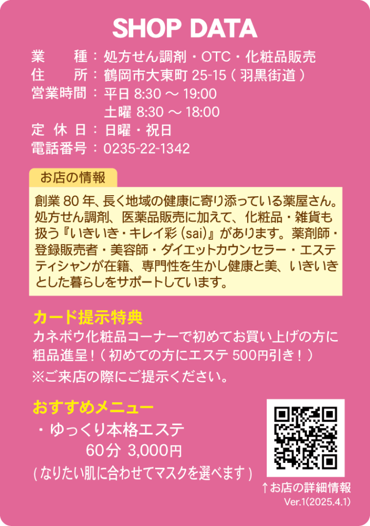 斎藤薬局さんは創業80年、4代に渡って長く地域の健康に寄り添っている薬屋さん。処方せん調剤、医薬品販売に加えて、化粧品・雑貨も扱う『いきいき・キレイ彩(sai)』があります。