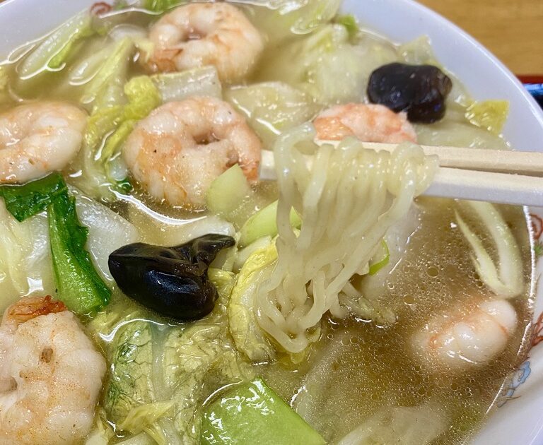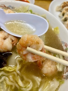 私もスタッフと一緒に平日開店ジャストでお店におじゃまして1日10食限定の蝦仁湯麺(シャーレータンメン)をいただきました。ぷりっぷりのエビがたまらない野菜もたっぷりのタンメンでした。スープに深みがあってタンメン好きをうならせる味だと思いました。こっそり聞いてみたら「白醤油」を使っているそうです。香り高いわけですね〜。