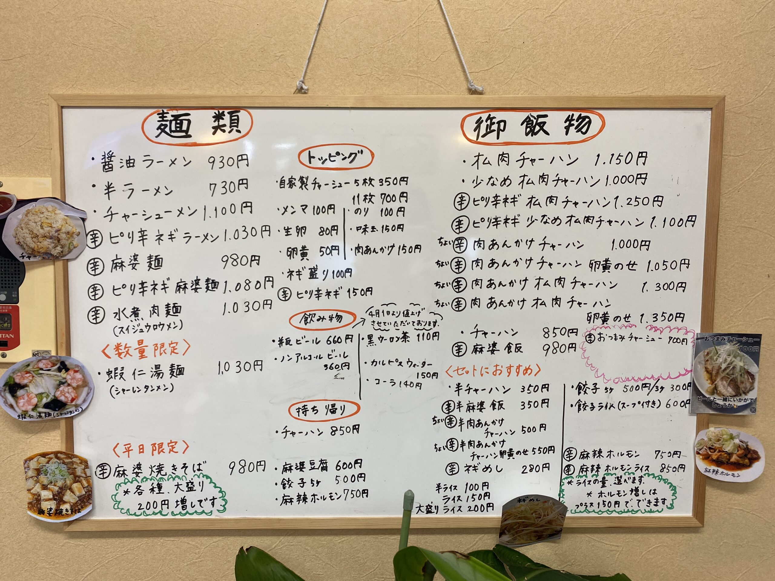 麺もラーメンだけでなく、中華店ならではの麻婆麺、蝦仁湯麺(シャーレー(エビ)タンメン)など試してみたい麺が並びます。蛸井さん独自のカラーが出ているのは「水煮肉麺(スイジュウロウメン)」。