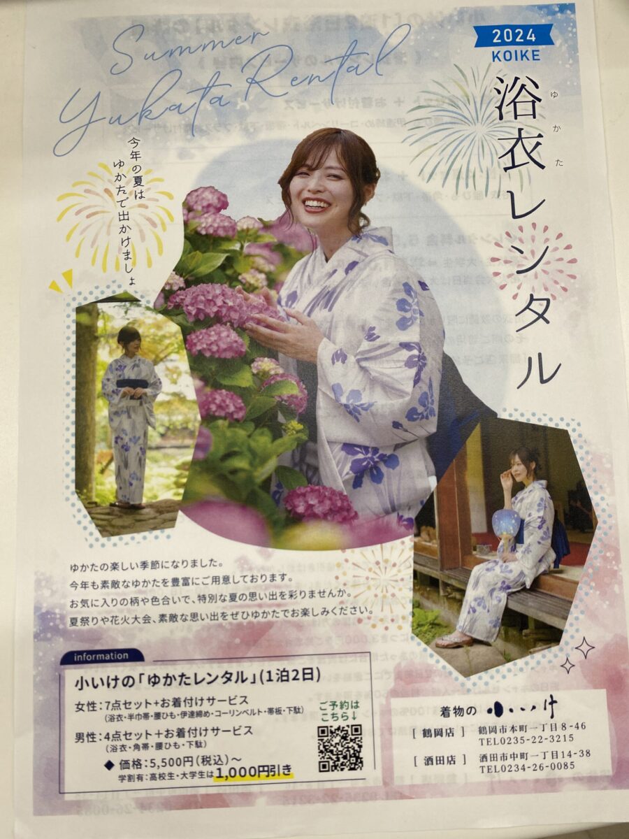 浴衣レンタルのチラシをいただきました。