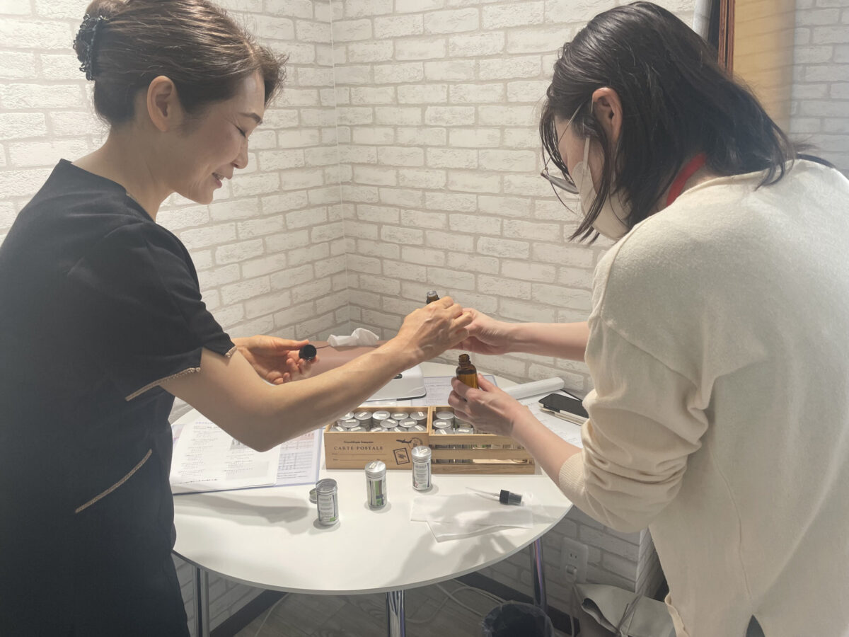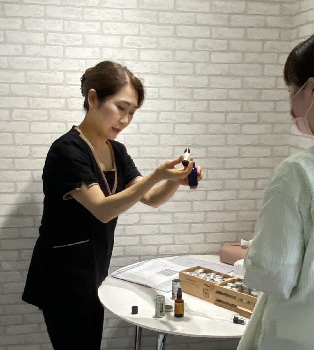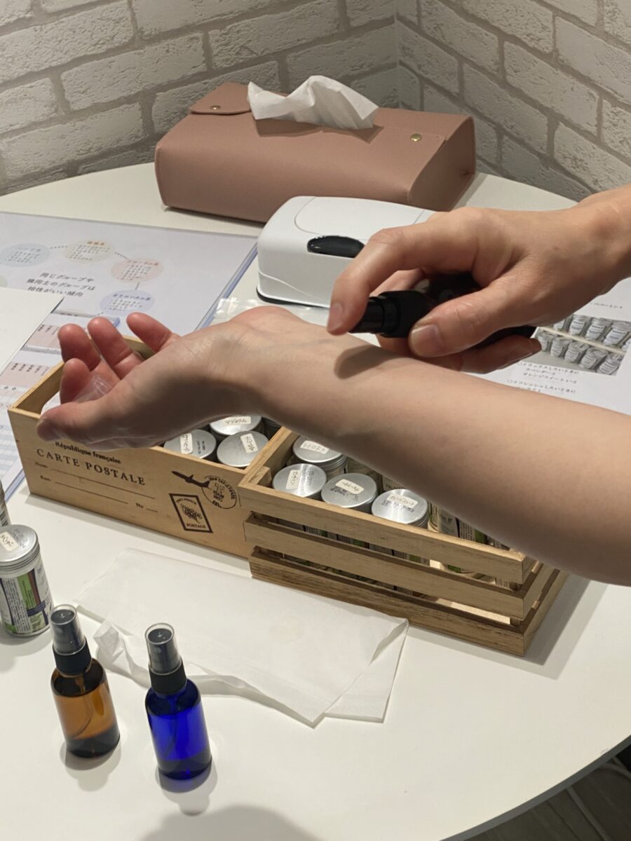 アロマオイルが初めて、というスタッフは、「芳香剤や香水のように香りが残ったり、ベタつくのかと思っていたけど