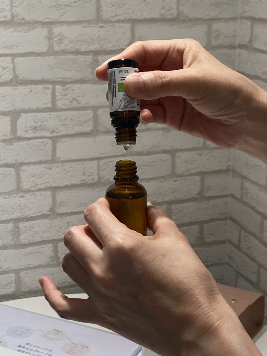 そのオイルに、効能や好みによって精油(エッセンシャルオイル)を選び、数滴ずつ加えて