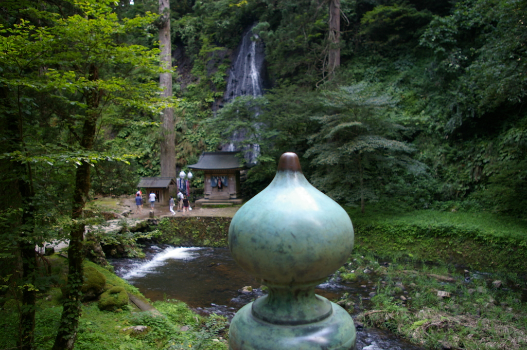 羽黒山随神門から石段を歩き、赤い欄干の秡川神橋を渡ってすぐの滝。