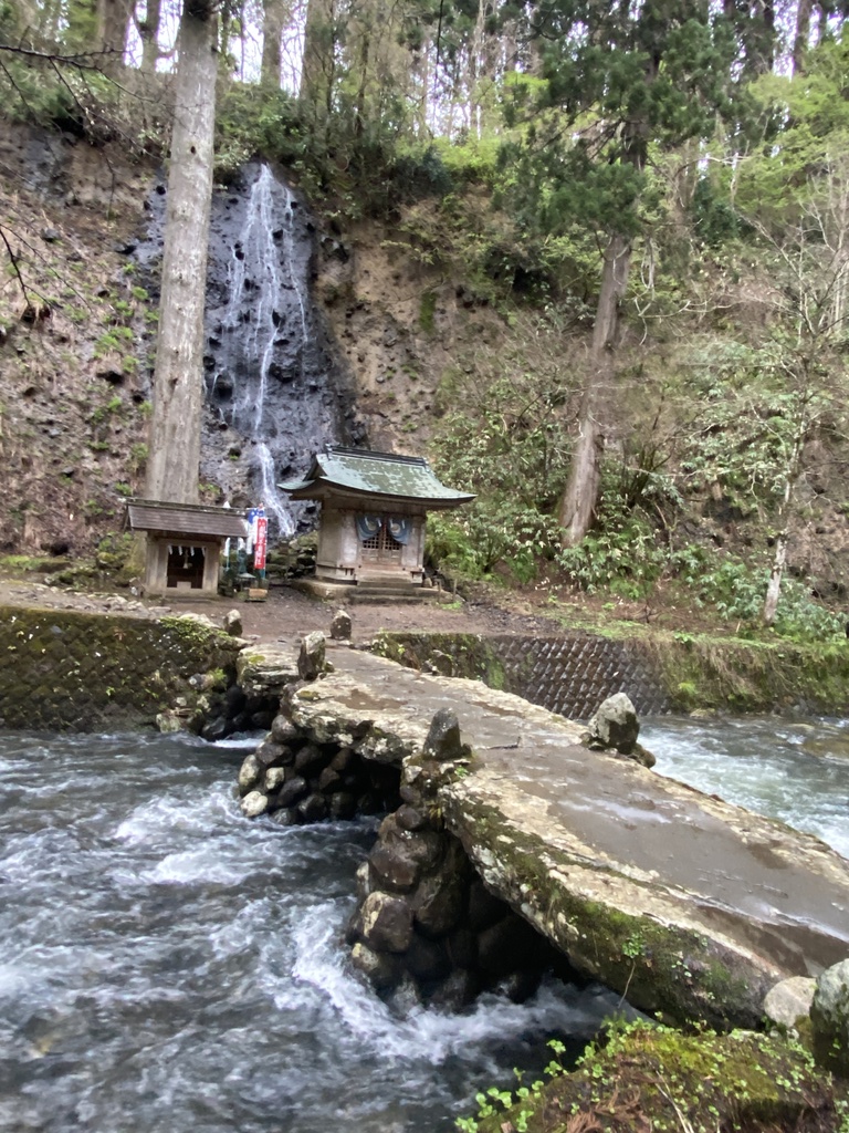 須賀の滝。石の橋を渡ってお参りすることができます。「岩戸分神社」と「秡川神社」の祠があります。