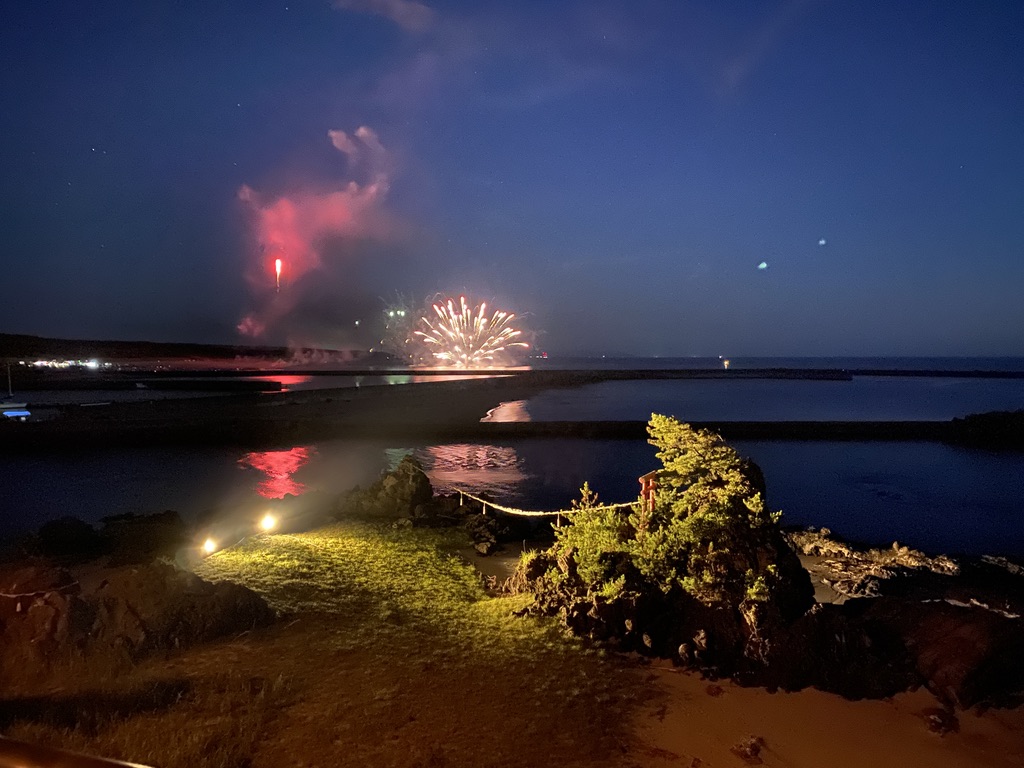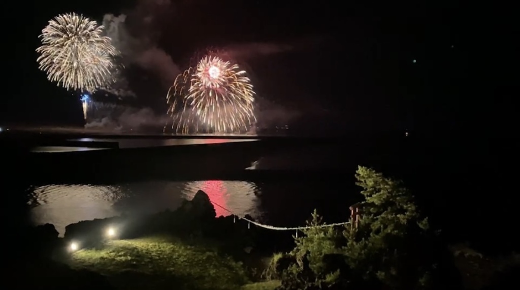 スマホで写すとピントが花火に合うか岩に合うかで迷ってしまうので、ぼやぼやになってしまい、なかなかスマホ撮影は難しいです。